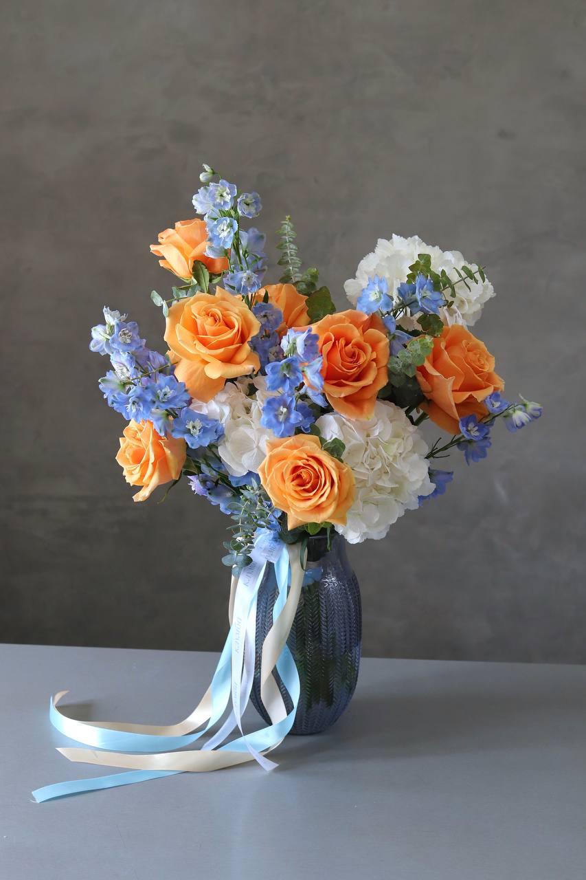 A flower arrangement of orange roses, delphiniums, white hydrangeas and eucalyptus in a glass vase. ...