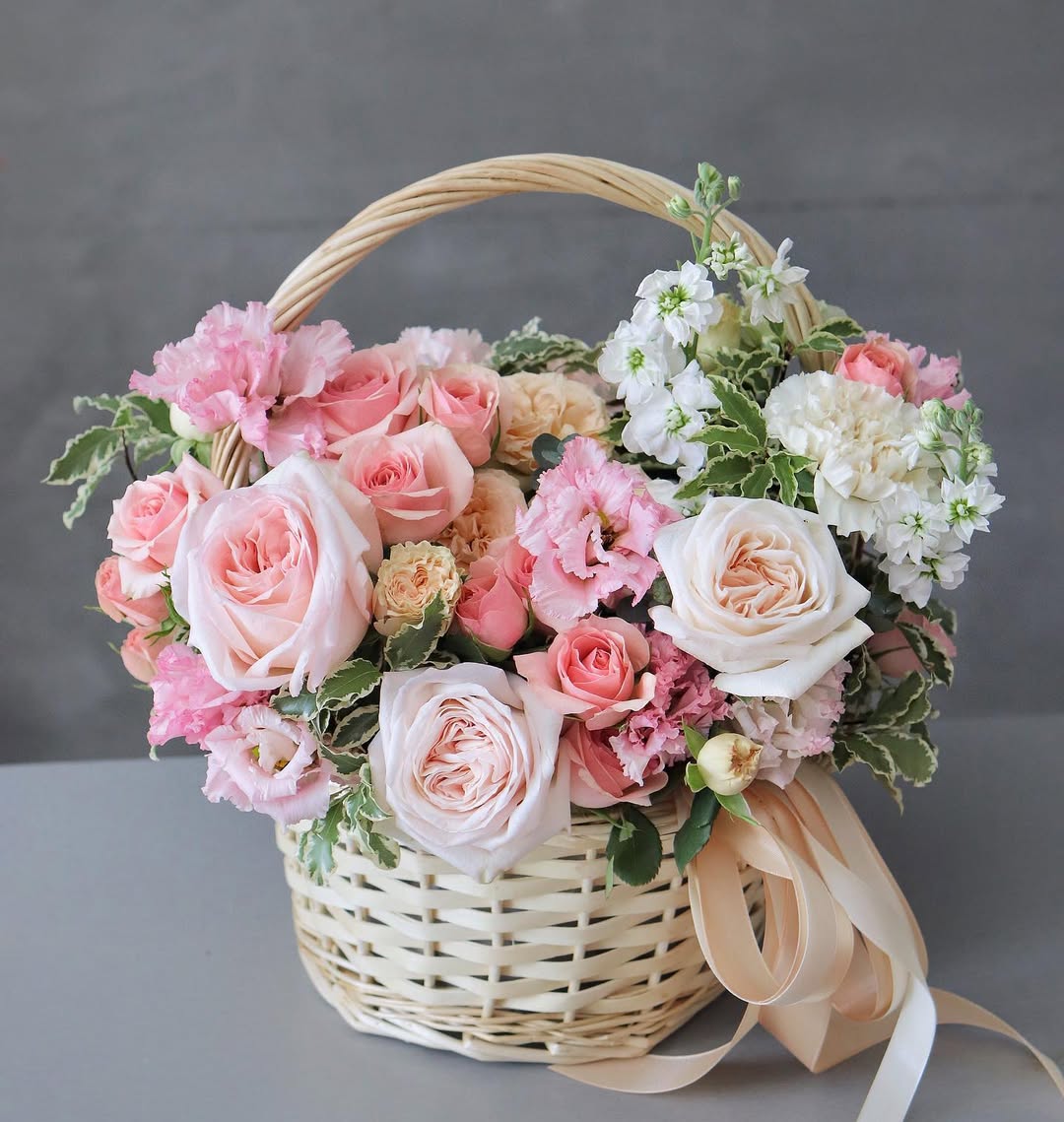 The Adeline Basket is a breathtaking floral arrangement featuring garden roses and eucalyptus in a...