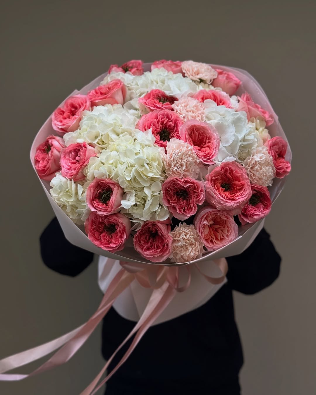 A bouquet of hydrangeas, Pink Expression roses and carnations. Perfect for spring birthdays and celebrations!