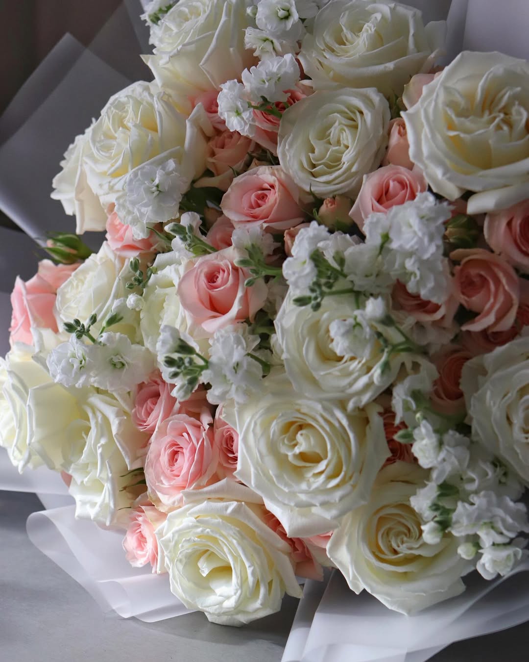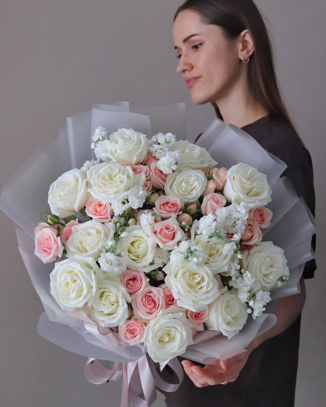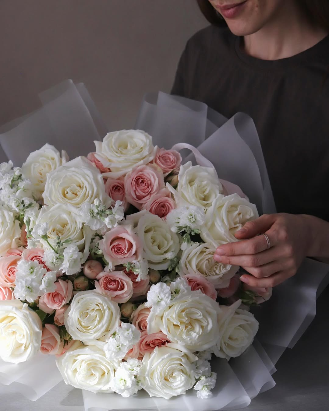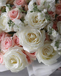 Anastasie is a graceful mix of white Playa Blanca roses, pink spray roses, and stock, creating a fresh and elegant flower arrangement. Perfect for birthdays, anniversaries, or romantic occasions, this bouquet brings timeless beauty and charm to any celebration.