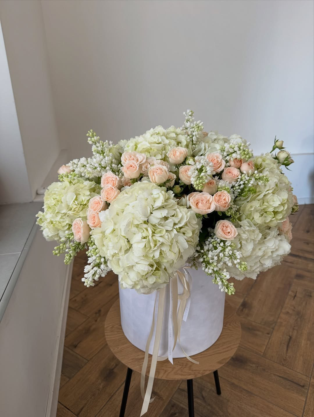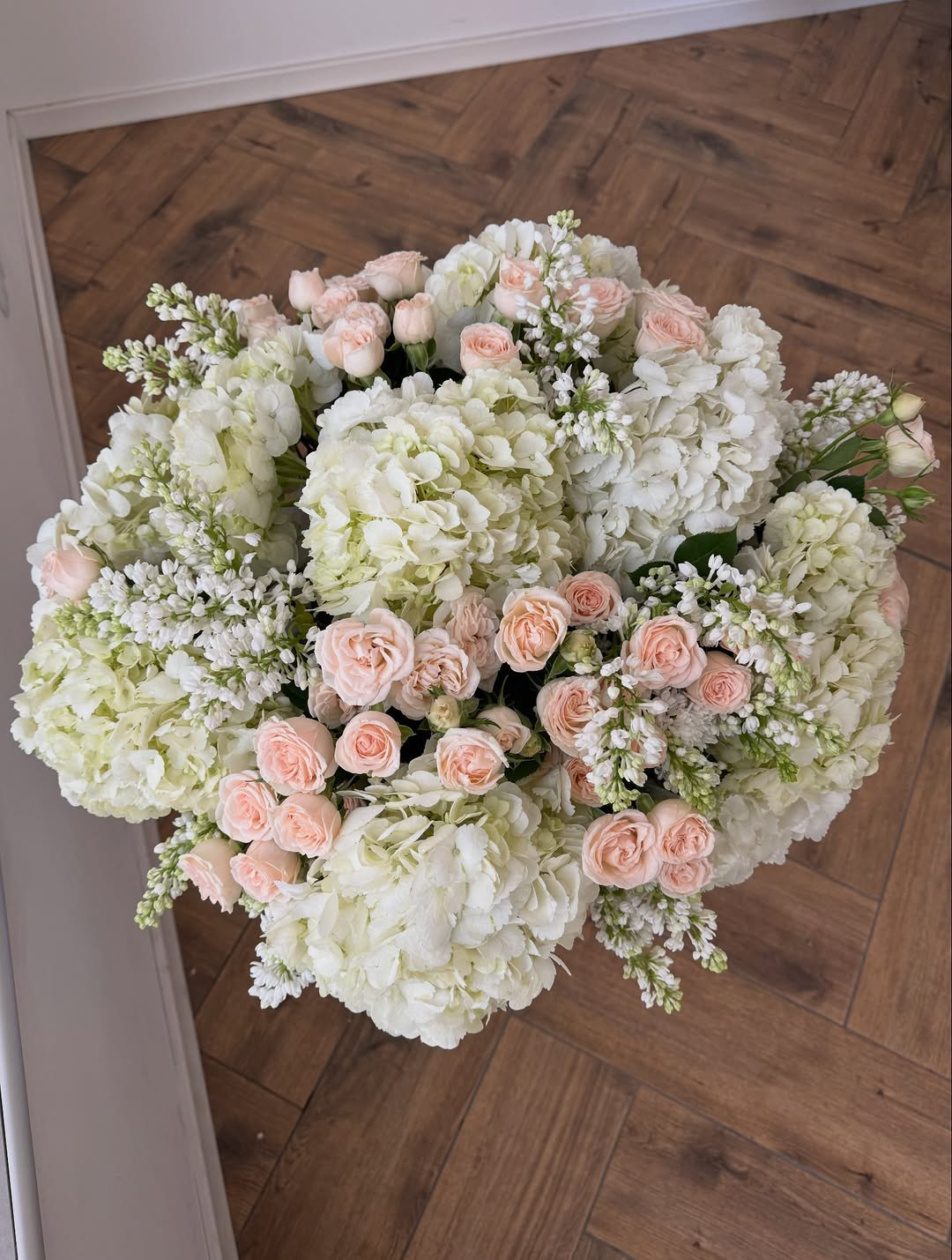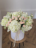 Fanny is a soft and fresh mix of white hydrangeas, delicate peach spray roses, and fragrant white stock. This elegant arrangement is perfect for birthdays, anniversaries, romantic surprises, or thank-you gifts, bringing a timeless and graceful touch to any occasion.