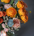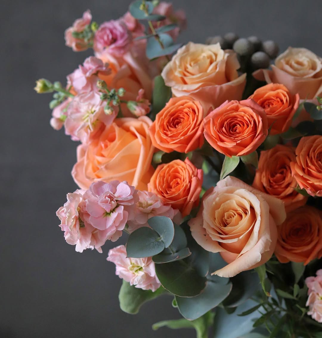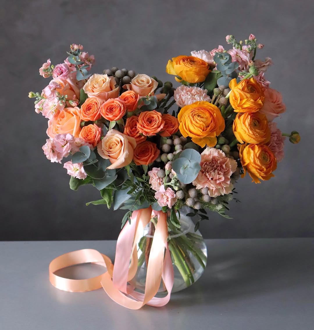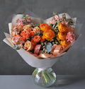 Marie Vase is a stunning arrangement featuring a delightful blend of ranunculus, stock, spray roses, carnations, and more, artfully arranged in a charming vase. In a soft yet vibrant palette of peach, orange, and pink, this bouquet radiates warmth, elegance, and joy. Perfect for birthdays, anniversaries, or simply brightening someone’s day, the Marie Vase is a timeless expression of beauty and love.