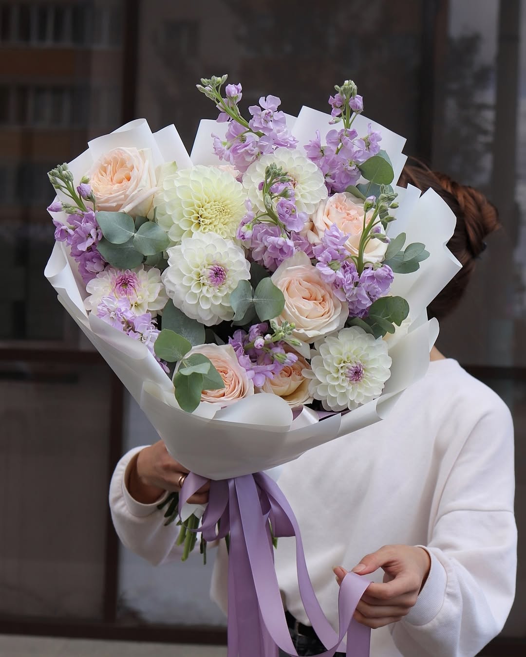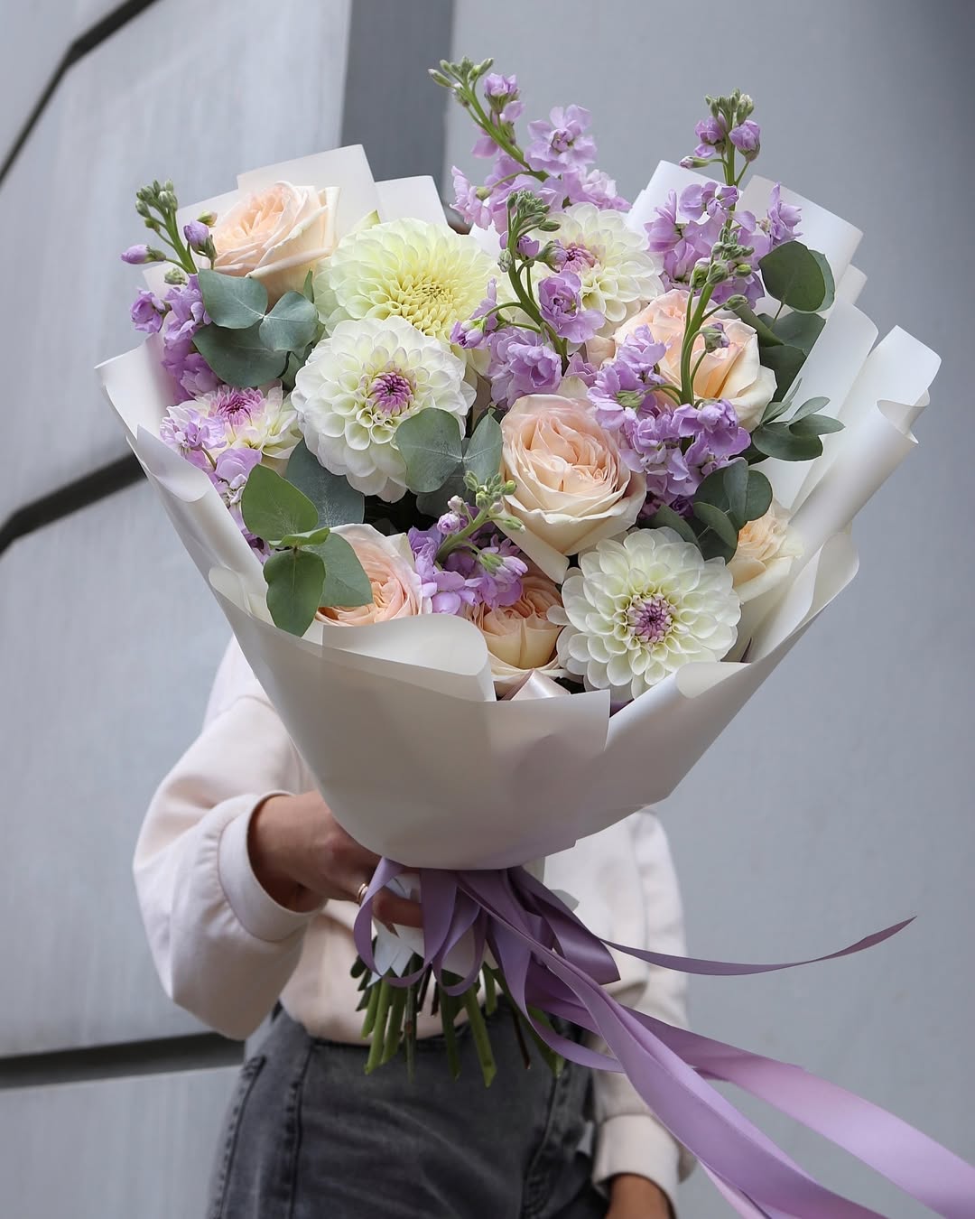 A flower arrangement of garden roses, stock, dahlias, and eucalyptus.
