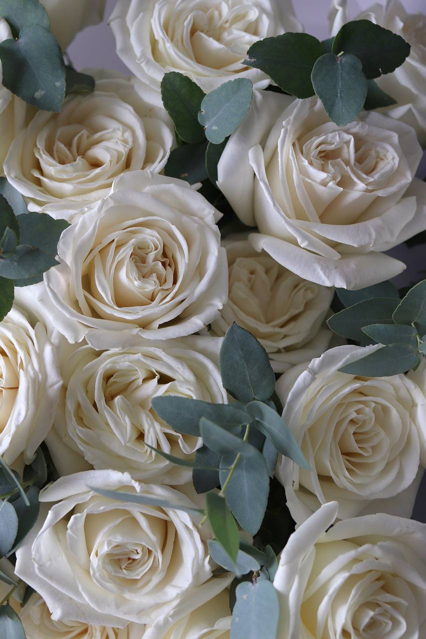 A classic combination of two dozen of white garden roses and eucalyptus.