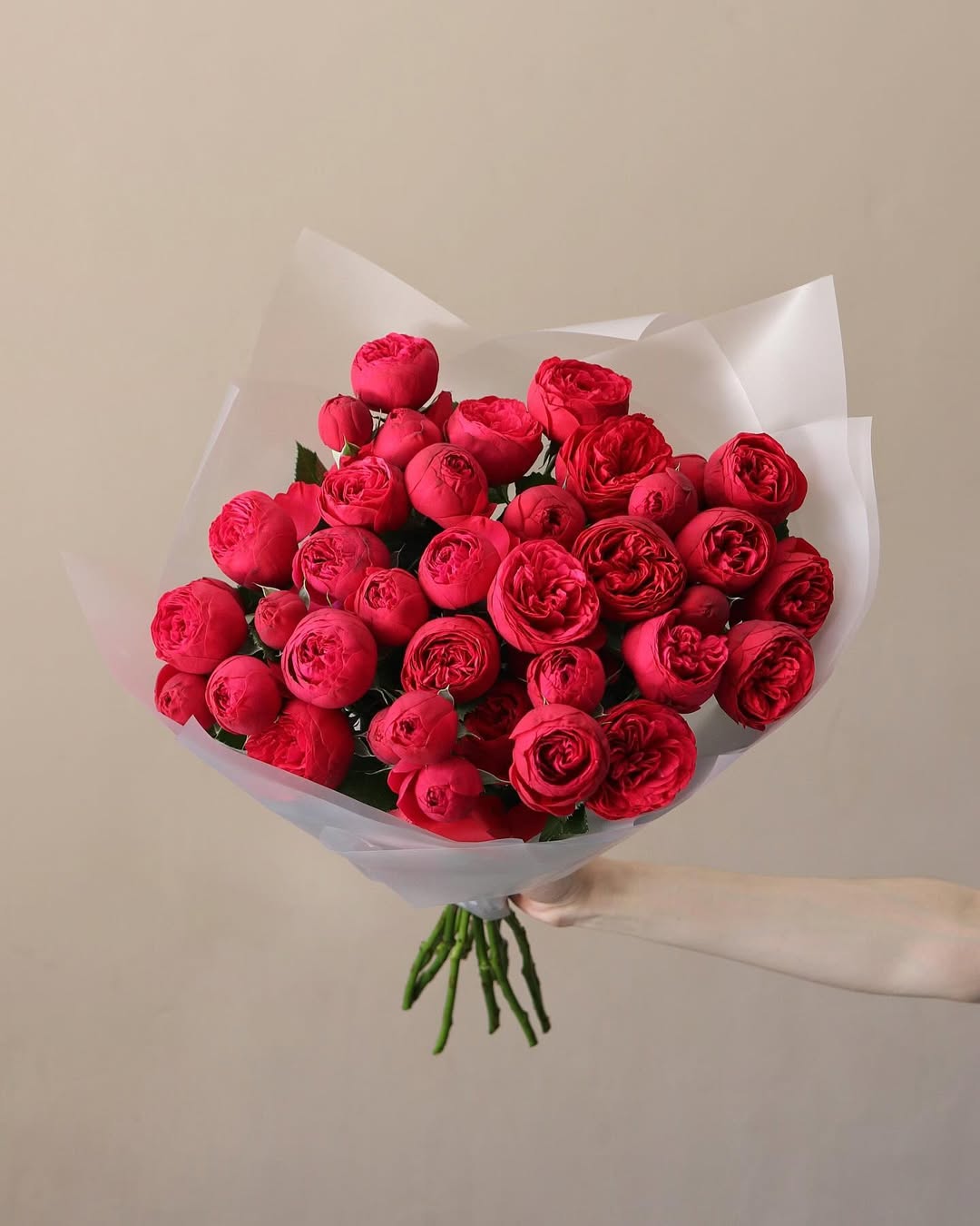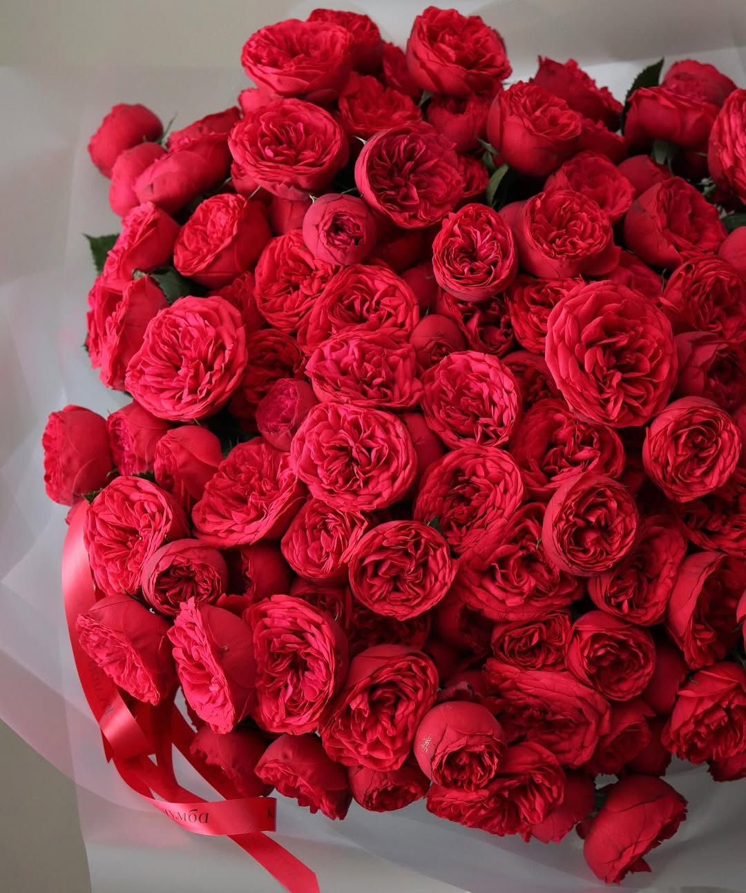 Gorgeous bouquet of garden peony roses Red Piano which includes 10, 30 and 50 pcs of long stem 50 cm roses. Make someone's day brighter ordering flower delivery from a local florist Amelie. Perfect choice for romantic occasion, birthday, anniversary, any holiday or just because.