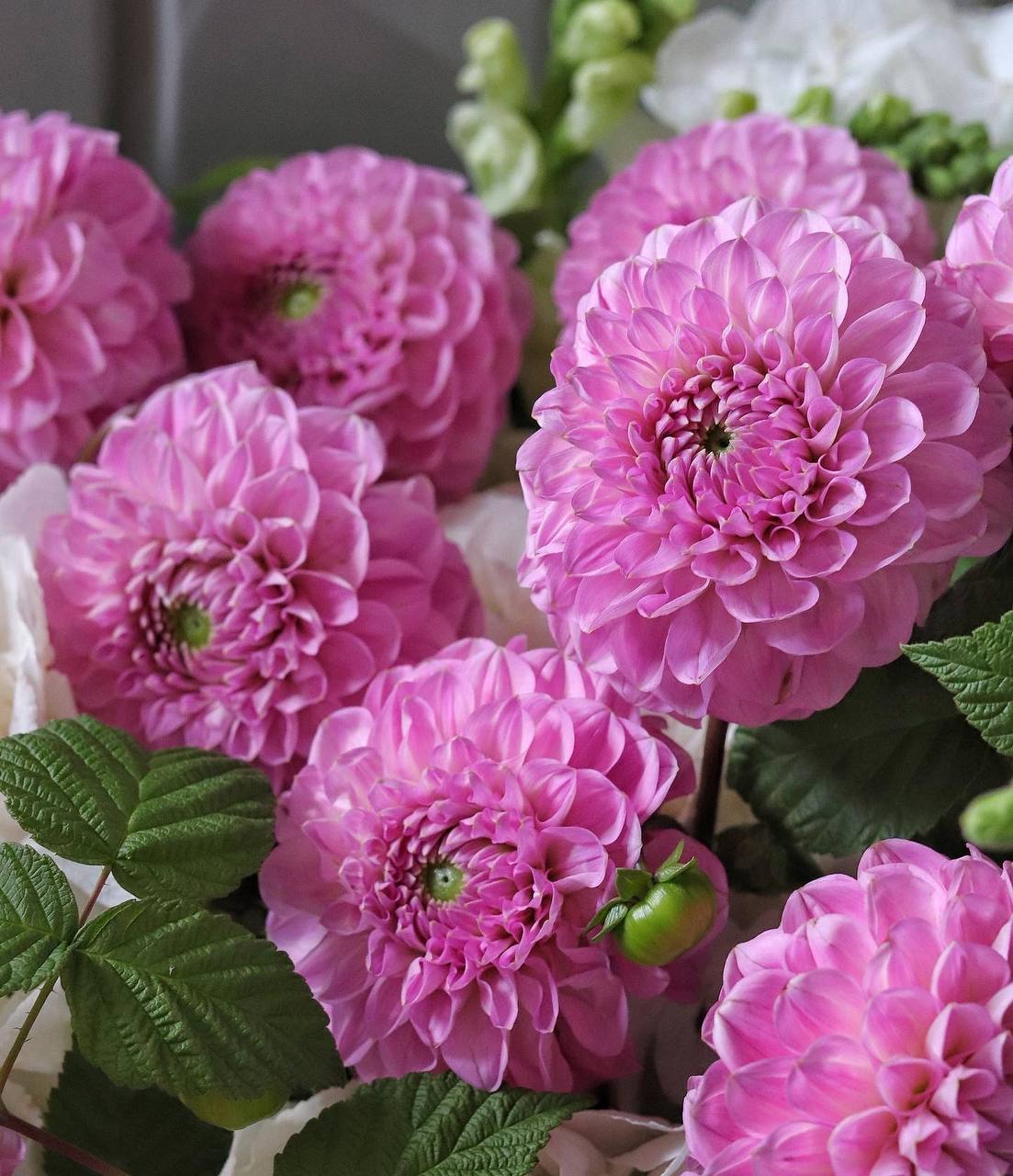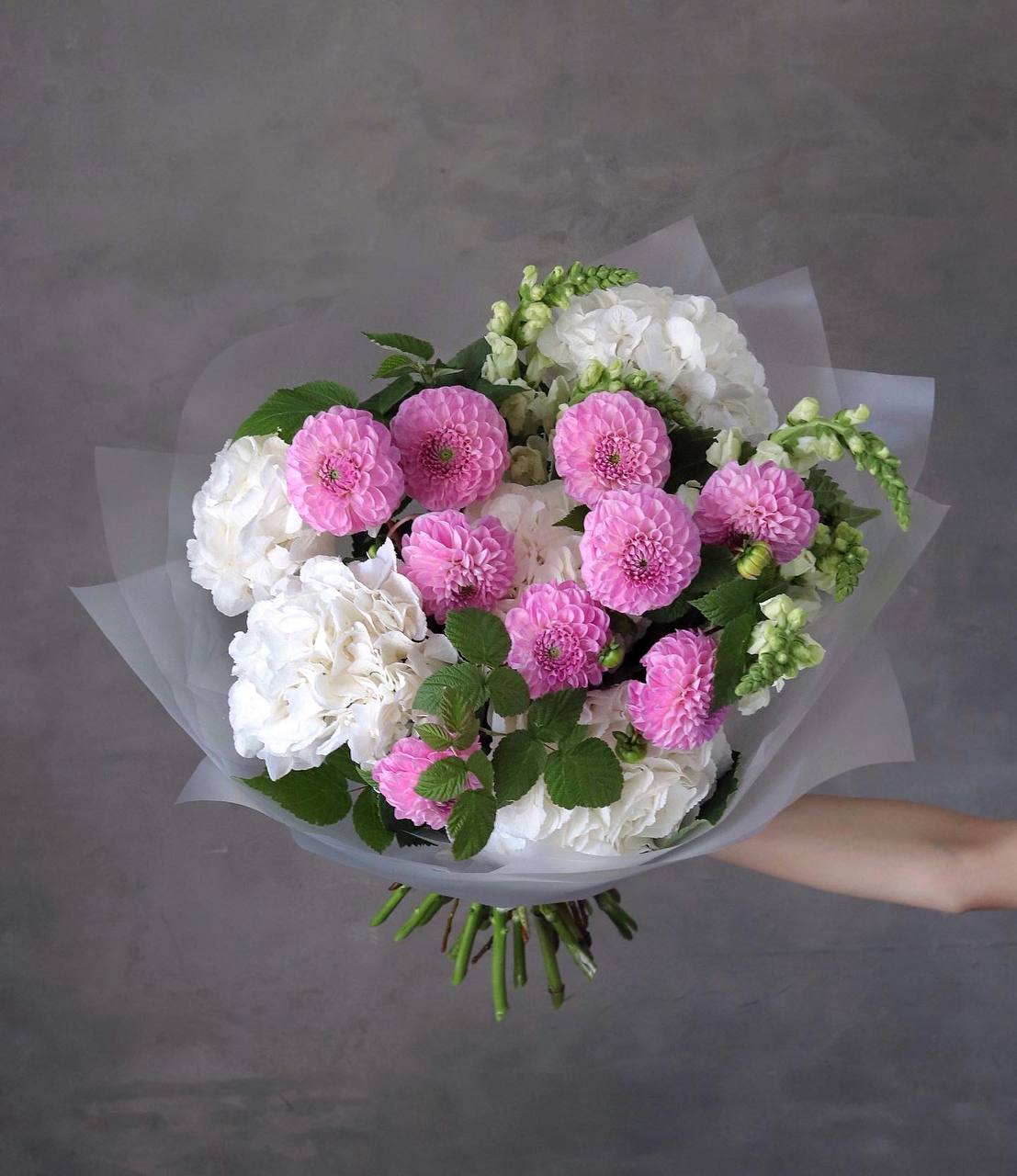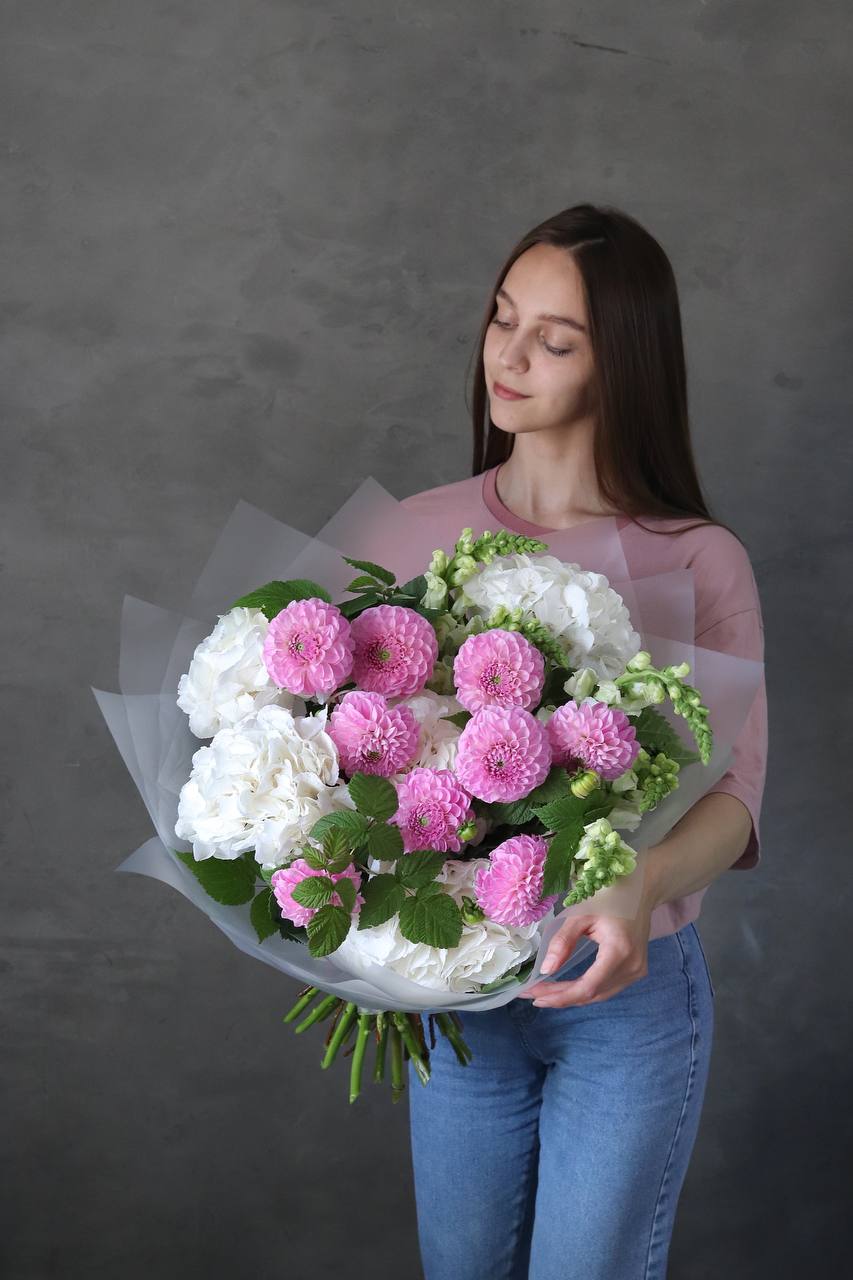 Graceful mix of white hydrangeas, pink dahlias, and snapdragons. Perfect for birthdays, anniversaries, Mother's Day or romantic occasions.