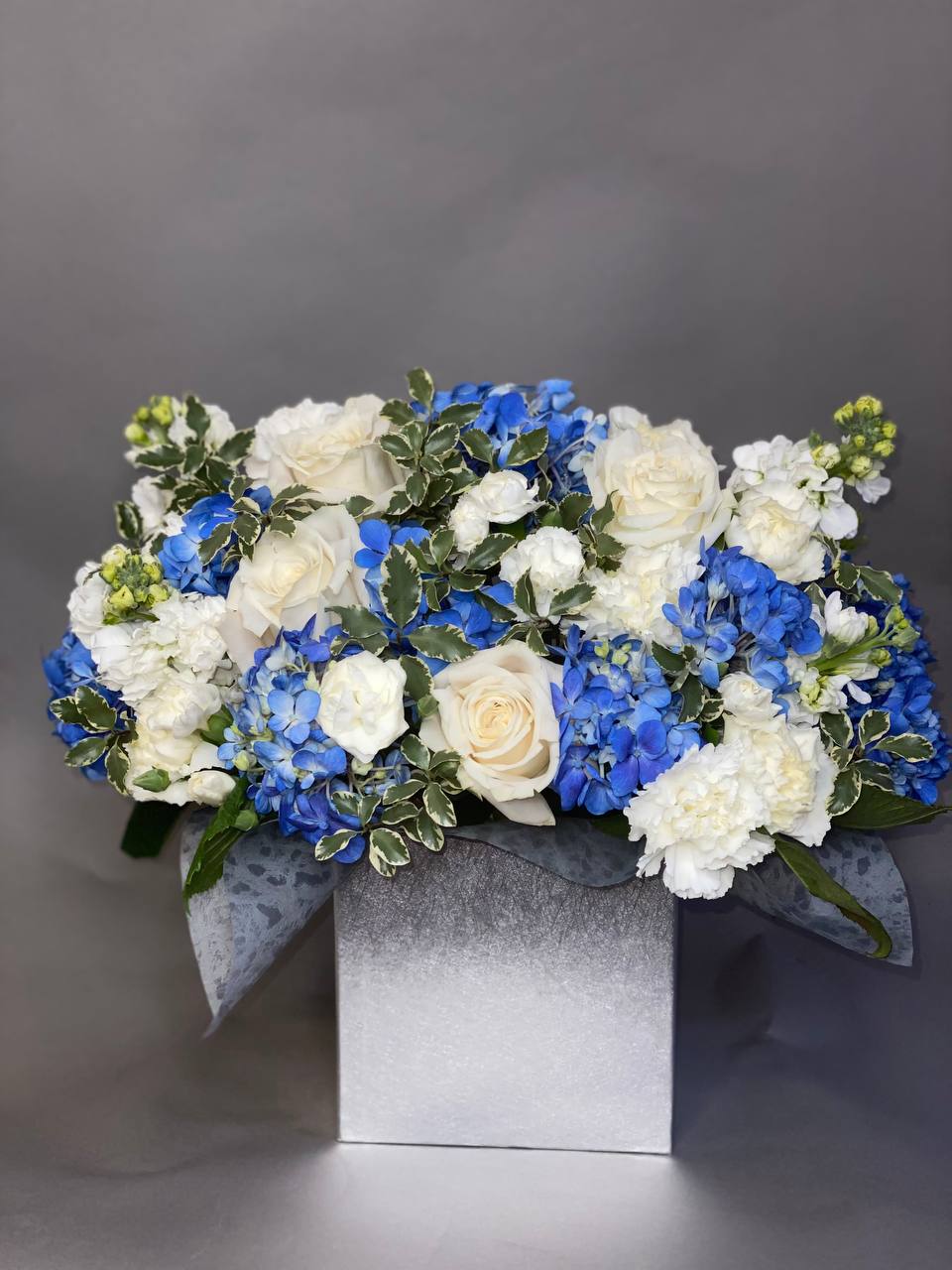 The Sophie Box is a perfect blend of elegance and charm, featuring white roses, delicate blue blooms, lush hydrangeas, soft stachys flowers, and graceful carnations. This stunning arrangement exudes beauty and serenity, making it an ideal choice for birthdays, celebrations, or simply brightening someone’s day.