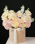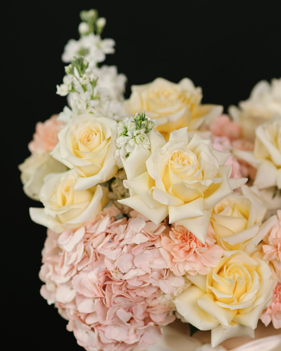 Vera is a romantic arrangement in a box featuring pink hydrangeas, light yellow (milk butter) garden roses, white stock, and pink carnations. This elegant mix of blooms is perfect for birthdays, anniversaries, romantic surprises, congratulations, or just because.